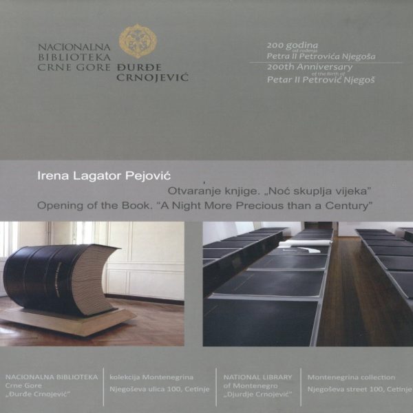 Lagator Pejović, Irena: OTVARANJE KNJIGE. “NOĆ SKUPLJA VIJEKA” : 200 godina od rođenja Petra II Petrovića Njegoša = OPENING OF THE BOOK. “A NIGHT MORE PRECIOUS THAN A CENTURY” : 200th Anniversary of the Birth of Petar II Petrović Njegoš. 2013. Urednik Jelena Đurović. Štampa DPC, Podgorica. Format 21 x 18. Strana 12 : ilustr. Tiraž 500. Broširano. Latinica